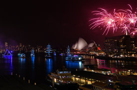 Tûzijátékkal köszöntik az új évet Sydney kikötõjében 2019. december 31-én, szilveszter éjszakáján. Középen az Operaház épülete. MTI/EPA-AAP/Dean Lewins