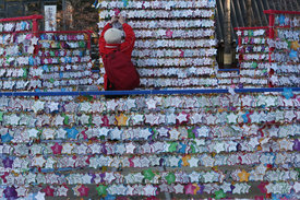 Újévi kívánságokkal teletûzdelt kerítés egy szöuli buddhista templomban 2019. december 31-én. MTI/AP/Ahn Jung Dzsun