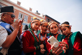 A nepáli gurung népcsoport népviseletbe öltözött tagjai szelfit készítenek az új év beköszönte alkalmából tartott ünnepségen, Katmanduban 2019. december 31-én. A brit hadsereg gurkha harcosai a gurung nemzetségbõl származnak. MTI/EPA/Hemanta Sreszta