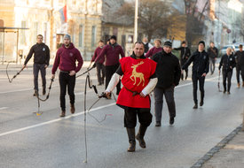 A Hét Csillag Kulturális Egyesület szervezésében, tizedik alkalommal megrendezett óévbúcsúztató ostormenet résztvevõi csergetnek ostoraikkal Pápa belvárosában 2019. december 31-én. MTI/Krizsán Csaba