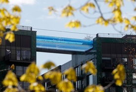 A világ első, levegőben létesített medencéje tíz emelet magasságban, 35 méterrel a londoni utcák fölött 2021. április 27-én. A két luxuslakóház közötti átlátszó, üvegfenekű medence május 29-től fogadja a fürdőzőket