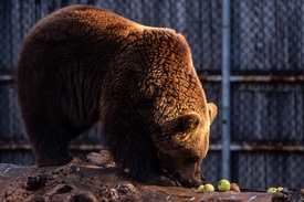 A Fővárosi Állat- és Növénykert barnamedvéje (Ursus arctos) a hagyományos medveárnyék-észlelés napján, 2022. február 2-án. Hugi, a barnamedve végül meglátta az árnyékát, ez a néphagyomány szerint azt jelenti, hogy a tél még sokáig fog tartani.