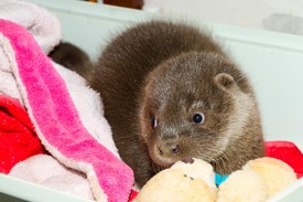 Mentett vidrakölyköt (Lutra lutra) nevelnek a Szegedi Vadasparkban, a tízhetes állatot egy gondozó cumisüvegből táplálja - közölte Veprik Róbert igazgató az MTI-vel.