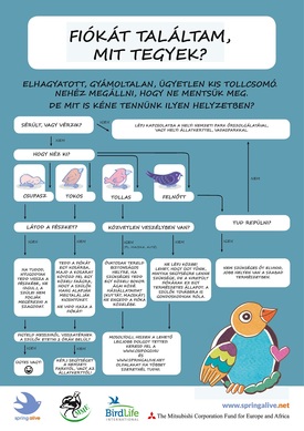 A közlemény kiemeli, hogy ilyen helyzetben az a legjobb megoldás, ha a nyílt helyen üldögélő fiókát óvatosan megfogva a legközelebbi sűrű aljnövényzetfoltba, bokor alá tesszük le. A hazai madárfajok nem szagolnak, így az érintésünk nem okoz problémát (a vadonban talált emlősök kölykeit viszont éppen jó szaglású szüleik miatt nem szabad megérinteni sem).