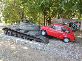 A Vukovári út és a Tripimir herceg utca kereszteződésében sajátságos emlékművet állítottak a harcoknak. Az installáció egy T55-ös tankot maga alá taposó kis piris FIAT-ot ábrázol. A jelenet arra emlékeztet, hogy 1991. június 27-én ugyanebben a kereszteződésben egy eszéki polgár, Branko Brekšić leállította kis piros FIAT-ját, hogy megállítsa a belváros felé száguldó jugoszláv tankokat. Az egyik T55-ös természetesen maga alá gyűrte a kisautót, de Dávid és Góliát küzdelméből végül mégis a gyengébbnek tartott fél, Horvátország került ki győztesen. Utólag az is kiderült, hogy a tankvezető szintén eszéki horvát fiú volt, a Jugoszláv Néphadseregbe besorozott Josip Ilić, akinek fejéhez pisztolyt szorított parancsnoka, így kényszerítette, hogy teljes sebességgel gázoljon át mindenen. Később megszökött az agresszoroktól, és beállt a horvát hadseregbe, történetesen ugyanabba a gárdadandárba, amelyben az eltiport kisautó tulajdonosa is szolgált. Akkor nem találkoztak, a háború után viszont igen, barátok lettek.