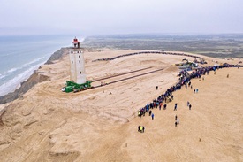 Az Északi-tenger partján emelkedő, 23 méter magas Rubjerg Knude világítótornyot, amely Dánia egyik fő turistalátványossága, síneken mozgó gördülőalkalmatosságra helyezték, hogy nagyon alacsony sebességgel 70-80 méterrel odébb, biztonságos helyre tolják.