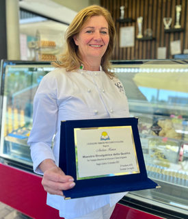 Koncz Andrea, a Sissi Fagyizó fagylaltmestere az Olasz Fagylaltkészítők Oktatóinak Szövetsége (AFPG) különdíjával, a „Minőség Mestere Díjjal”.
