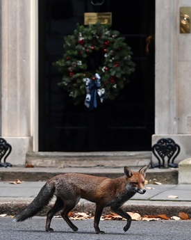 Róka a londoni kormányfői rezidencia, a Downing Street 10. bejárata előtt 2022. december 6-án