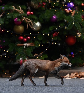 Róka a londoni kormányfői rezidencia, a Downing Street 10. karácsonyfája előtt 2022. december 6-án