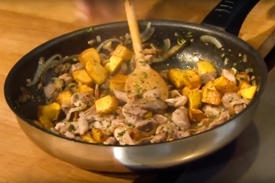 „Egy fej hagymát és egy szál sárgarépát karikára vágva egy kanálka zsírban megfuttatunk. Adunk hozzá személyenként 7 deka kis kockára vágott marhalapockát, sózzuk, paprikázzuk és időnként egy kis víz hozzáadásával fedő alatt puhára pároljuk. Egy külön edényben kevés zsírral, sóval, vágott zöldpetrezselyemmel, kockára vágott burgonyát pirítunk, melyet a puhára párolt aprópecsenyével összeforrósítunk. Fejessalátával fogyasztjuk el.”