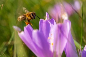 Méh gyűjt virágport virágzó őszi kikericsről (Colchicum autumnale) a Zala megyei Magyarszentmiklós közelében 2021. szeptember 24-én