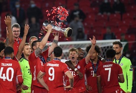 A Bayern München játékosai ünnepelnek a bajnoki trófeával, miután 2-1-re gyõztek a Sevilla ellen a labdarúgó Európai Szuperkupa döntõjében játszott Bayern München – Sevilla mérkõzésen a budapesti Puskás Arénában 2020. szeptember 24-én
