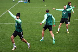 Szoboszlai Dominik (b), a magyar labdarúgó-válogatott játékosa a csapat edzésén a telki edzõközpontban a Bulgária elleni Európa-bajnoki selejtezõ mérkõzés elõtti napon, 2023. november 15-én.