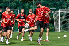 Szoboszlai Dominik csapatkapitány (j) a magyar labdarúgó-válogatott edzésén a Telki edzõközpontban 2024. június 7-én, egy nappal az Izrael elleni debreceni barátságos mérkõzés elõtt.