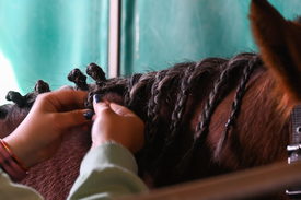 Egy versenyló sörényét fonják be a Magyar Póni Klub Szövetség által rendezett Póni Klub Országos Bajnokságon Balatonvilágoson 2024. október 13-án.