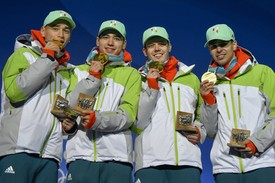 A négyes tagjai továbbra sem fogynak ki a poénokból, amíg egy nappal korábban a kangnungi jégcsarnokban a Usain Bolt jamaicai sprinter védjegyévé vált beállással szórakoztatták a közönséget, addig ezúttal lassított felvételt imitálva léptek fel a dobogó tetejére.