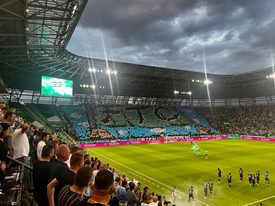 A hazai szurkolók ezúttal is élőképpel fogadták kedvenceiket, amelynek központi elemében zöld alapon fekete-fehér betűkkel rajzolódott ki az FTC felirat.