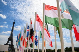 A magyar zászló az Eiffel-toronyhoz közeli Trocadéro téren a 2024-es párizsi nyári olimpia megnyitója előtt egy nappal