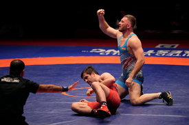 Bajcajev Vlagyiszlav (j), miután győzött a szlovák Batyrbek Tcakulov ellen a bukaresti birkózó Európa-bajnokságon