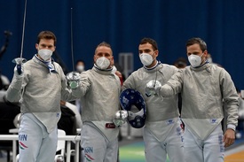Szatmári András, Decsi Tamás, Szilágyi Áron és Gémesi Csanád, a magyar férfi tőrcsapat tagjai a Zarándi Csaba kard csapat világkupaversenyen a BOK Sportcsarnokban Budapesten 2021. március 14-én