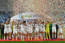 Az ETO FC Győr játékosai ünnepelnek, miután győztek a Simple női labdarúgó Magyar Kupa döntőjében a Puskás Akadémia FC ellen az Új Hidegkuti Nándor Stadionban 2023. április 26-án