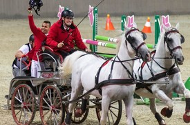A győztes Szuhai Rodrigo (k), Dani Marcell Balázs fogathajtó (j) és Dani Iván segédhajtó (b) a Masters Nemzetközi Díjugrató Verseny Ride and Drive versenyében a Szilvásváradi Lipicai Lovasközpontban 2022. július 30-án. MTI/Balázs Attila