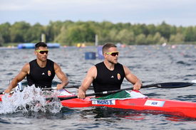 Az ebben a számban világ- és Európa-bajnok Nádas Bence és a tokiói olimpián K-1 200-on aranyérmes Tótka Sándor jól jött el a rajtból és hamar az élre állt. A friss Eb-győztes magyar egységet fűthette a bizonyítási vágy, mivel csütörtökön a négyessel csak hetedikek lettek. Nádas nyert már világ- és Európa-bajnokságot ebben a számban Kopasz Bálinttal és tavaly másodikak lettek a vb-n, most viszont külön indultak. Ez a magyar hajó féltávnál is vezetett, végül pedig a németek mögött ért célba, azaz a továbbjutás biztosan meglett.