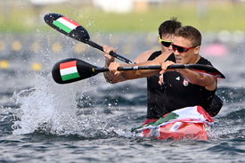 Kopasz Bálint (elöl) és Varga Ádám a férfi kajak párosok 500 méteres versenyének középfutamában a 2024-es párizsi nyári olimpián a vaires-sur-marne-i evezős és kajak-kenu pályán 2024. augusztus 9-én