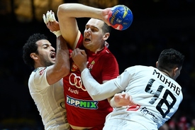 Az egyiptomi Ibráhim el-Mászri (b) és Mohab Abdel Hak (j), valamint Ligetvári Patrik a férfi kézilabda olimpiai kvalifikációs világbajnokság 7. helyéért játszott Magyarország – Egyiptom mérkőzésen a stockholmi Tele2 Arénában 2023. január 29-én.