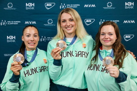 Újra csillogó bronzéremmel a nyakában fotózkodhatott szerdán a tavalyi párizsi olimpián harmadik helyezést elért Muhari Eszter, Fojt Sára és Major Veronika. A három olimpikon helyszínen kapott medáljainak állaga ugyanis megromlott, ezért azok cserére szorultak.