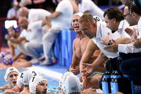 A férfi pólósaink elődöntője előtt a környékbeli bárokban, éttermekben mindenhol magyar csoportokat lehetett látni. Mindenki a maga módján melegített a nagy összecsapásra. A magyar drukkerek megelőlegezett bizalma látszott nemzeti együttesünk felé, hiszen az elődöntőre jelentős számú drukker váltotta meg előre a belépőjét. Nem tartottunk népszámlálást, de a hangerő alapján erre a meccsre érkezett a legtöbb magyar. A himnuszokat követően mindkét csapat beugrott a vízbe, a magyarok már egy kört alkottak, de Vogel Soma még a medence szélén váltott pár szót Gárdonyi András kapusedzővel és csináltak pár közös mozdulatot.