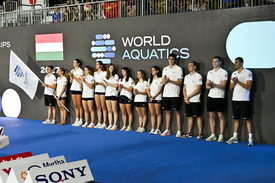A magyar úszóválogatott tagja a vizes sportokat tömörítõ nemzetközi szövetség zászlójával a szingapúri vizes világbajnokságon a World Aquatics Arénában 2025. augusztus 3-án. Az úszóversenyek utolsó napi döntõi elõtt hivatalosan is megtörtént a zászlóátadás, amivel Budapest megkezdte „felkészülését” a két év múlva sorra kerülõ világeseményre. A zászlót Wladár Sándor, a Magyar Úszó Szövetség elnöke vette át Huszain al-Muszallamtól, a World Aquatics elsõ emberétõl.