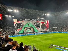 A csapatokat a ferencvárosi szurkolók hatalmas kifeszített molinóval fogadták, melyen egy zöld színű Forma-1-es autó száguld az „Europa League” felirat felé, a visszapillantóban az AS Monaco és a Trabzonspor látszott, míg a pálya szélén a Crvena zvezda lerobbant autója füstölt.