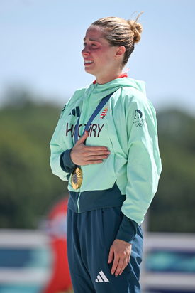 Az aranyérmes Gulyás Michelle a nõi öttusázók eredményhirdetésén a 2024-es párizsi nyári olimpián a versailles-i kastély parkjában 2024. augusztus 11-én.
