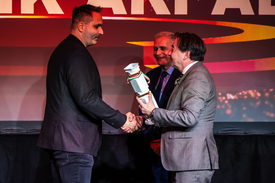 Az úszókkal foglalkozó Jancsik Árpád (b) átveszi az Év fogyatékos sportolókkal foglalkozó edzõje díjat Szabó Lászlótól, a Magyar Paralimpiai Bizottság (MPB) elnökétõl (j) és Mravik Gusztávtól, a Magyar Sportújságírók Szövetségének elsõ elnökétõl (k) az MPB gáláján, a Paralimpiai Legendák Estjén a Puskás Arénában a Magyar Parasport Napján, 2025. február 22-én.