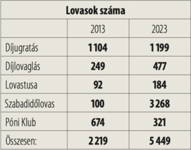 A Magyar Lovassport Szövetség egységes nevezési programjának statisztikái szerint az olimpiai szakágakban folyamatosan emelkedik a versenyeken minősítő pontot gyűjtők száma. Az utánpótlás-nevelésben átrendeződés tapasztalható: az angol mintára szervezett Póni Klubban csökken, a szabadidősöknél meredeken emelkedik a startszám. A szabadidősök III. országos bajnokságára már négy nap kellett a Nemzeti Lovardában, hogy a 81 ülésverseny, ügyességi, díjlovas- és díjugrató-feladat 1616 startja lebonyolítható legyen. A komplex tudást igénylő lovastusa is megjelent körükben: Szabolcsban Bubán Zsolt barcelonai lovastusa-olimpikon szervezésében 2023-ben regionális terep-Championátust hirdettek.