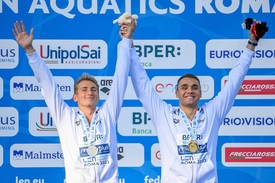 Az aranyérmes Milák Kristóf (j) és a második helyezett Márton Richárd a férfi 200 méteres pillangóúszás döntőjének eredményhirdetésén a római vizes Európa-bajnokságon a Stadio Del Nuotóban 2022. augusztus 16-án