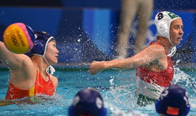 Keszthelyi Rita (j) és a kínai Niu Kuan-nan a világméretû koronavírus-járvány miatt 2021-re halasztott 2020-as tokiói nyári olimpia nõi vízilabdatornájának negyedik fordulójában játszott Magyarország – Kína mérkõzésen a Tacumi Vízilabdaközpontban 2021. augusztus 1-jén.