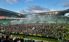 A lefújáskor a szurkolók a pályára futottak, hogy együtt ünnepeljenek a játékosokkal.