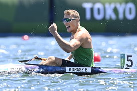 Az aranyérmes Kopasz Bálint a férfi kajak egyesek 1000 méteres versenyének döntõje után a világméretû koronavírus-járvány miatt 2021-re halasztott 2020-as tokiói nyári olimpián a Sea Forest Kajak-kenu Pályán 2021. augusztus 3-án.