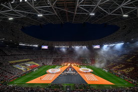 A telt házas stadion közönsége nagyjából ötperces, de annál látványosabb, tüzes és fényjátékos elemeket tartalmazó felvezetést tekinthetett meg a csapatok kivonulása előtt. Mindkét klub szurkolói látványos élőképpel fogadták a kedvenceiket. A rómaiak bordó-sárgába borították a szektoraikat úgy, hogy kirajzolódott a „figli della lupa„, azaz „a farkas gyermekei” szöveg, mellette pedig az olasz trikolor színei jelentek meg, míg a sevillaiak kifeszítettek egy hatalmas molinót, amelyen a kupát tartja egy ember, mellette római számokkal a trófea elhódításának hat évszáma szerepelt, valamint fölötte az „imperium nostrum„ latin felirat, amivel jelezték, a sorozat csúcstartójaként az Európa-liga az ő területük.