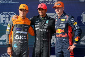 Az elsõ helyezett Lewis Hamilton, a Mercedes brit versenyzõje (k), a második helyen végzett Max Verstappen, a Red Bull holland pilótája (j) és a harmadik helyezett Lando Norris, a McLaren brit versenyzõje a Forma-1-es Magyar Nagydíj idõmérõ edzése után a mogyoródi Hungaroringen 2023. július 22-én.