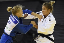 Karakas Hedvig (fehérben) és az orosz Anasztaszija Konkina küzd a budapesti cselgáncs Grand Slam-verseny -52 kilogrammos súlycsoportjának első körében a Papp László Budapest Sportarénában 2020. október 23-án