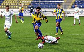 Nagy Dániel (középen) a Mezőkövesd Zsóry FC–Kaposvári Rákóczi FC labdarúgó-mérkőzésen 2020. február 12-én