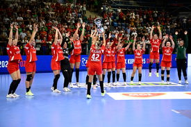 A magyar válogatott játékosai miután megnyerték a Magyarország – Svédország nõi kézilabda felkészülési mérkõzést a JYSK Kupán a Tatabányai Multifunkciós Csarnokban 2025. szeptember 20-án. Magyarország-Svédország 34-32.