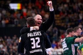 Palasics Kristóf László (háttal) és Bartucz László, a magyar válogatott kapusai ünnepelnek, miután csapatuk 33-25-re legyõzte Izlandot a csoportkör harmadik fordulójában a férfi kézilabda olimpiai kvalifikációs Európa-bajnokságon a müncheni Olympiahalléban 2024. január 16-án.