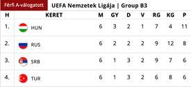 A magyar labdarúgó-válogatott megnyerte csoportját a Nemzetek Ligája B divíziójában, ezzel feljutott az élvonalba: szerdán az utolsó, hatodik fordulóban a mieink 2-0-s győzelmet arattak a török csapat felett, míg az eddig éllovas oroszok kikaptak Szerbiában.