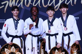 Az aranyérmes Salim Omar Gergely (b2), az ezüstérmes mexikói Cesar Rodríguez (b) és a bronzérmes tajvani Csen Po-jen (j2), illetve délkoreai Be Dzsun Szo (j) a guadalajarai tekvondo-világbajnokság férfi 54 kilogrammos súlycsoportjának eredményhirdetésén 2022. november 19-én. MTI/EPA/EFE/Francisco Guasco
