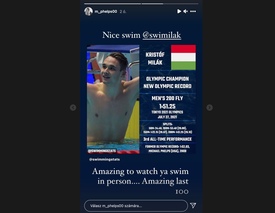 – Szép úszás volt, lenyűgöző téged élőben látni! Fantasztikus utolsó 100 méter! – írta az Instagram-oldalán Phelps Miláknak üzenve.