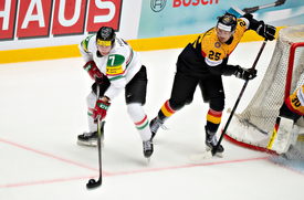 Mihalik András és a német Leon Huttl (j) a dán-svéd közös rendezésû világbajnokság elsõ fordulójában, a B csoportban játszott Németország-Magyarország mérkõzésen a dániai Herningben 2025. május 10-én.